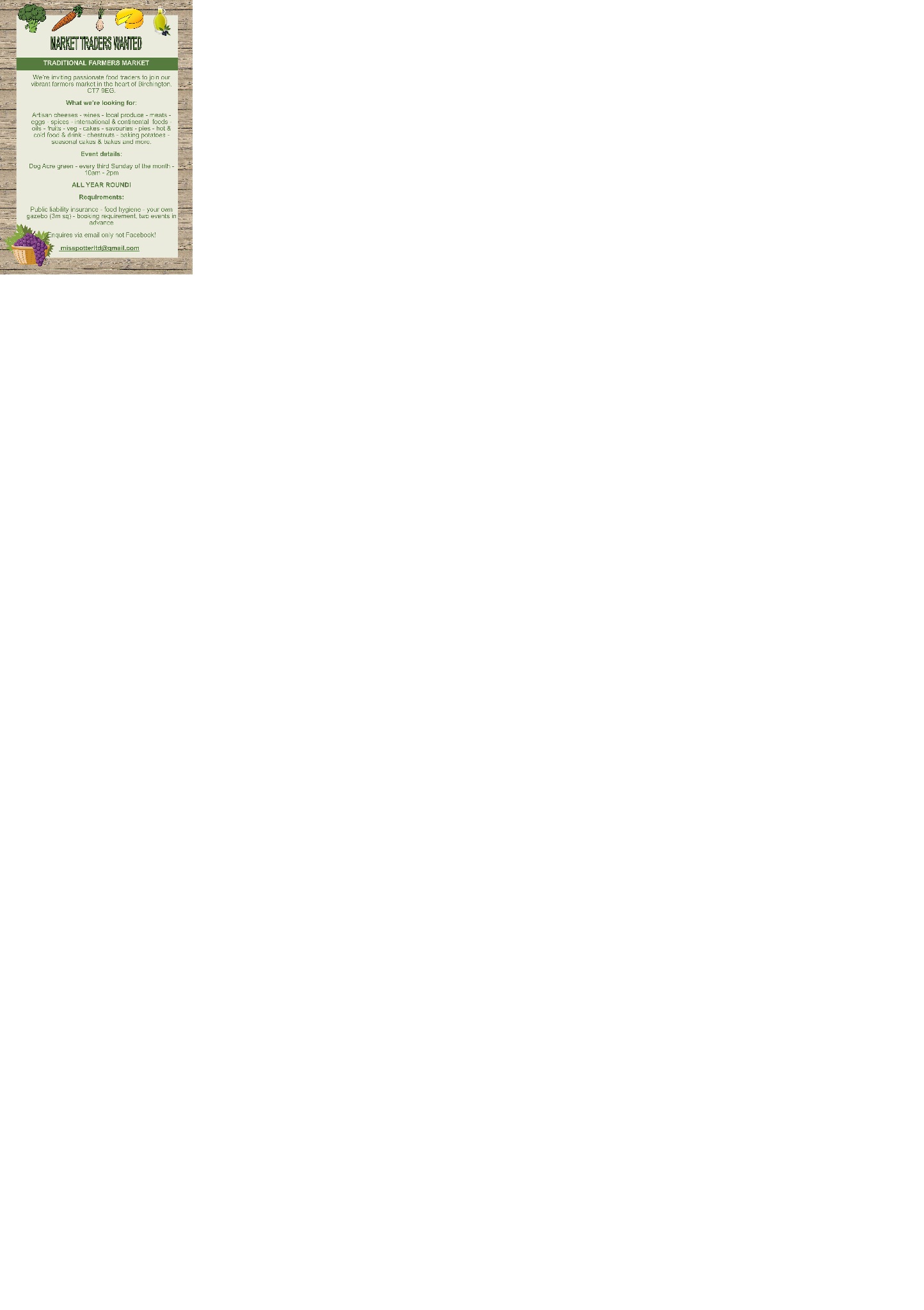 Would you like market reminders or newsletters? Click here 1st Saturday every month, 9.00am - 12 noon
